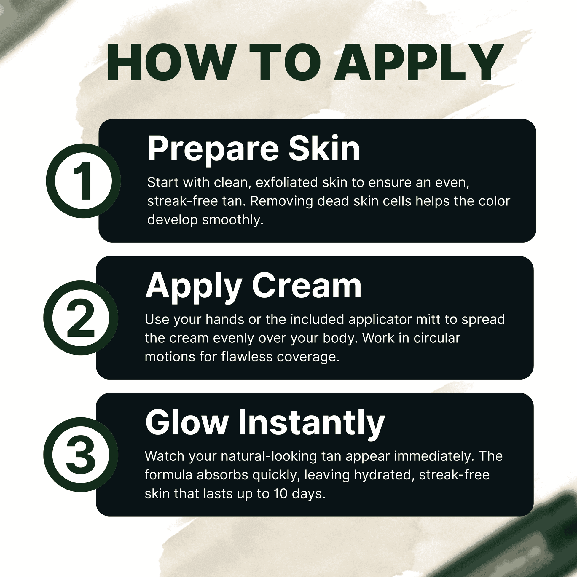 Apply effortlessly with a mitt or your hands. Quick-drying, streak-free, and mess-free, it’s your simple secret to a perfect glow every time.